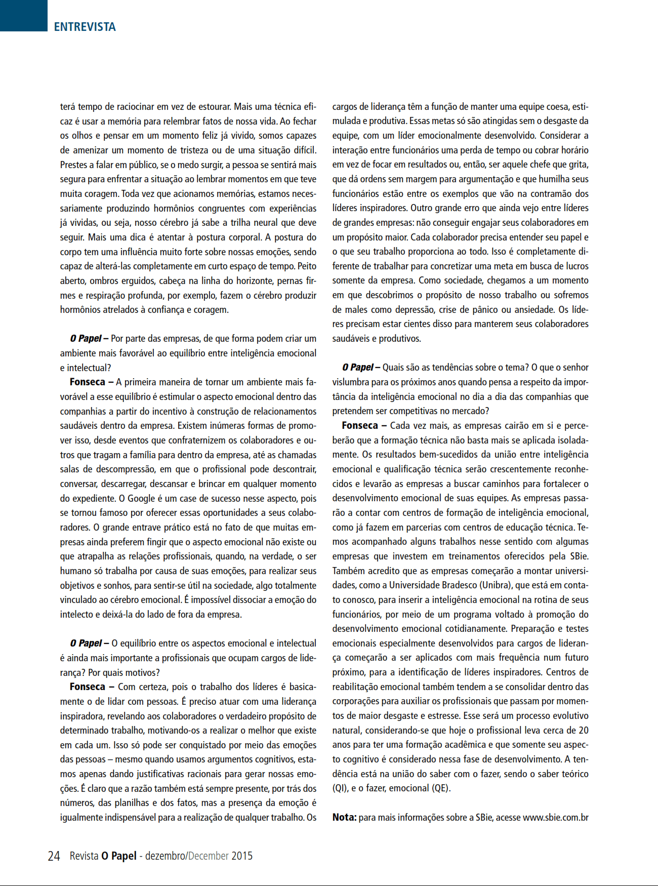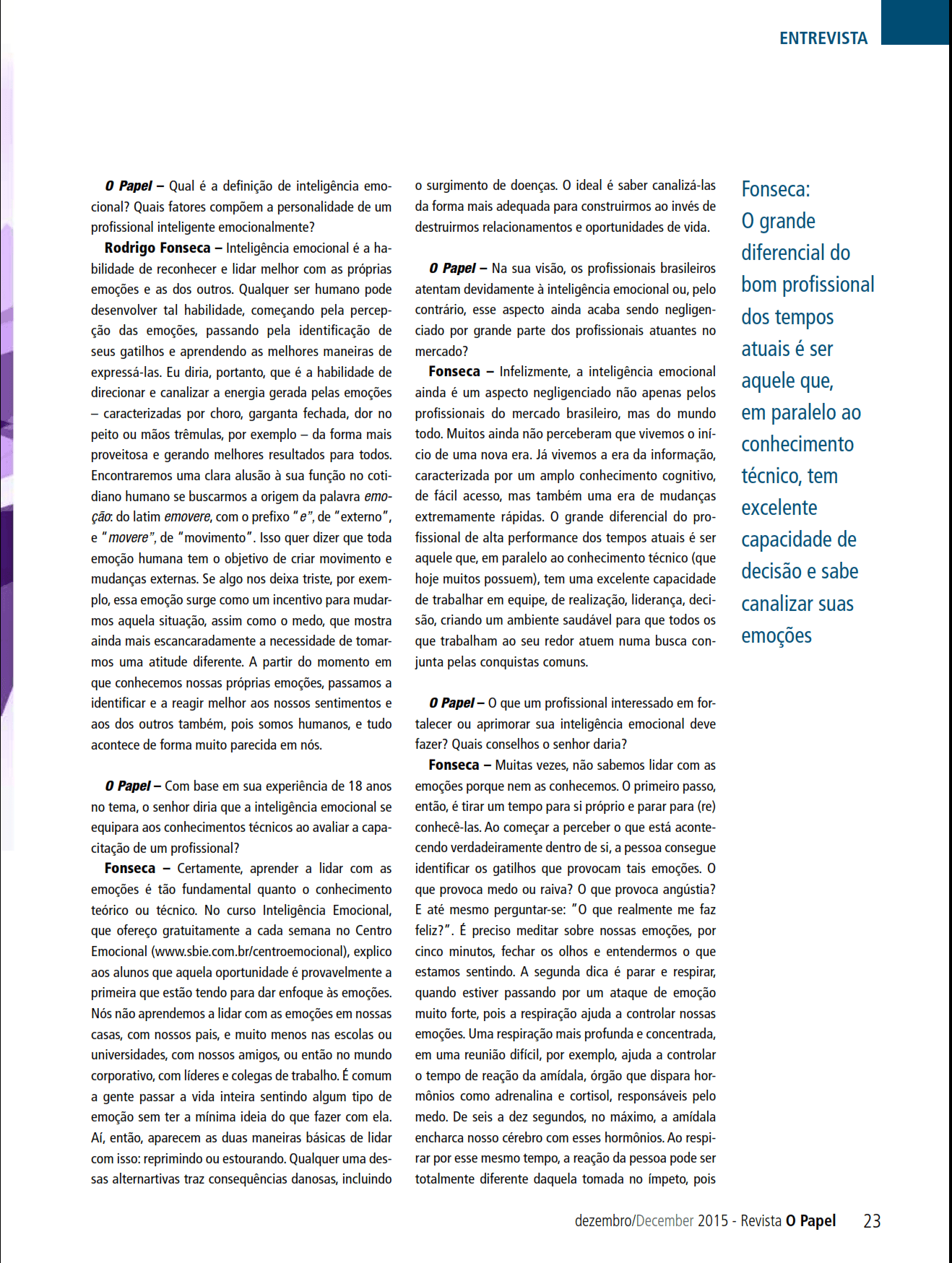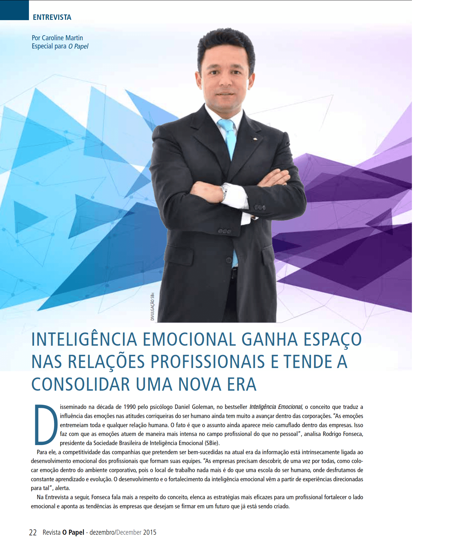 Em entrevista realizada por Caroline Martin, da Revista O Papel, o presidente da SBie, Rodrigo Fonseca, lecionou sobre o assunto e abordou a importância em tratar todas as questões ligadas ao universo empresarial. Responsável por aplicar os conceitos do treinamento a novos praticantes, Rodrigo explica como o trabalho realizado com as emoções está totalmente vinculado aos objetivos profissionais/pessoais e o sucesso em cada um deles.